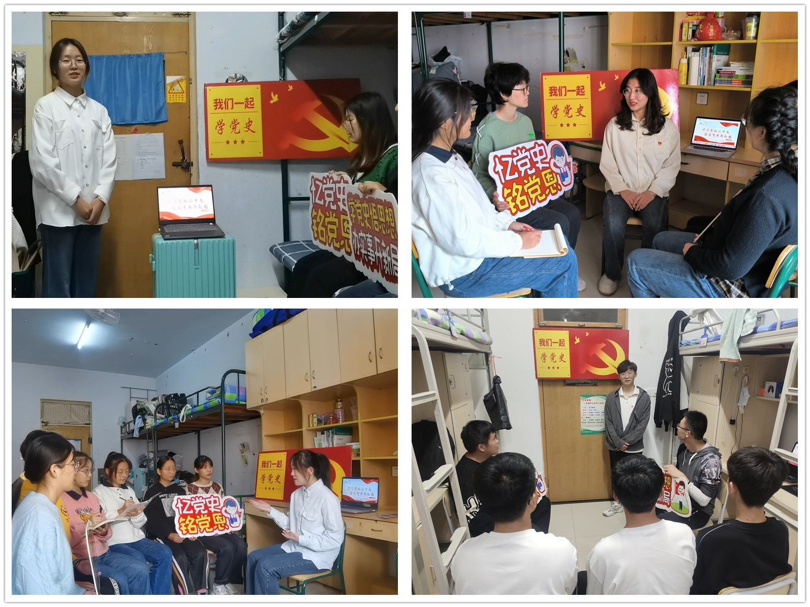 10月12日-10月31日,21名员工党员合理分工、有序组织,利用课余时间深入到自己所联系的员工宿舍,选取不同的党史故事、先进人物事迹等,通过微党课的方式将二十大精神的学习深入更多学子心中,变“一人讲”为“多人讲”,把“小寝室”变成了“大课堂”。