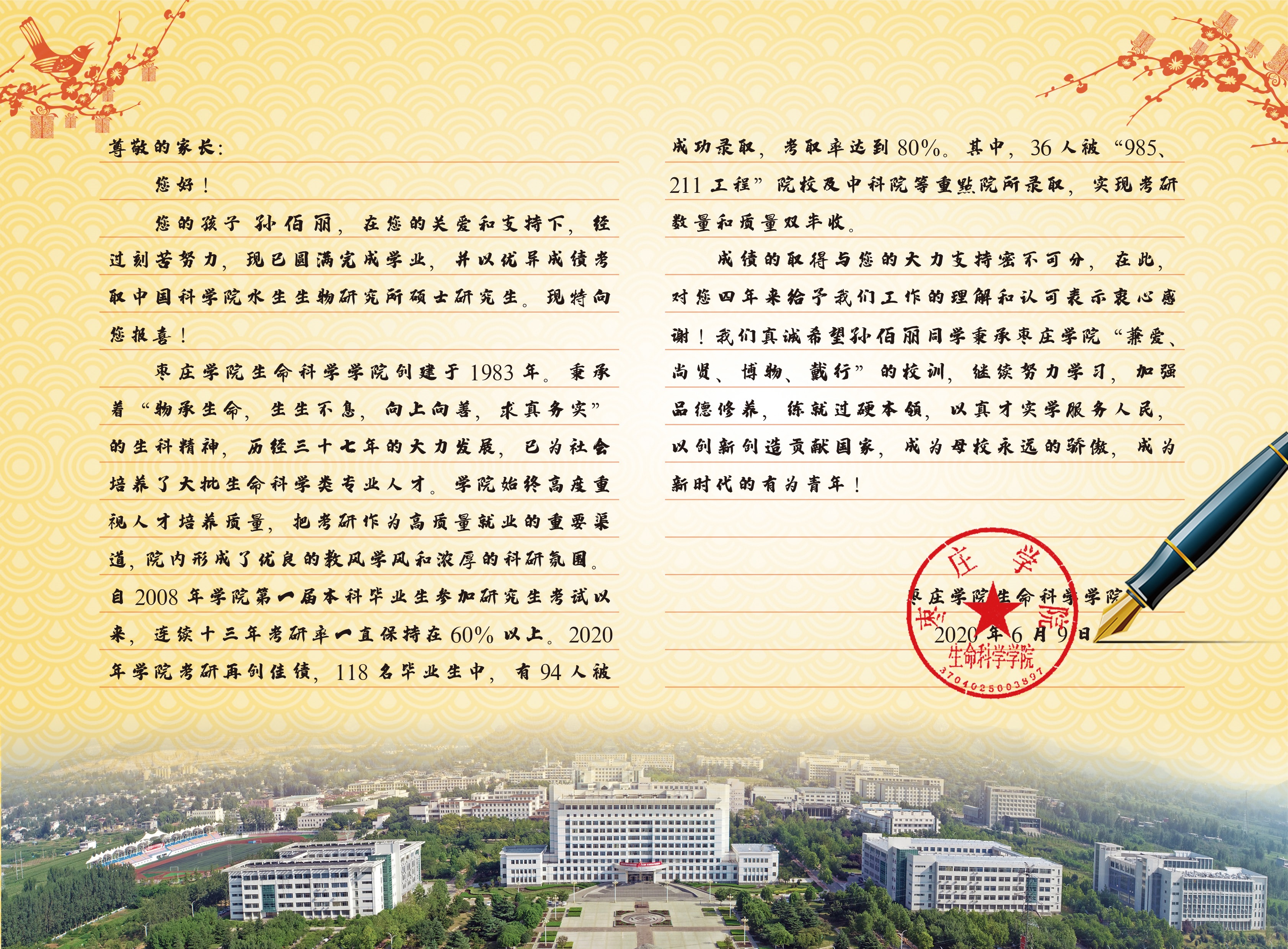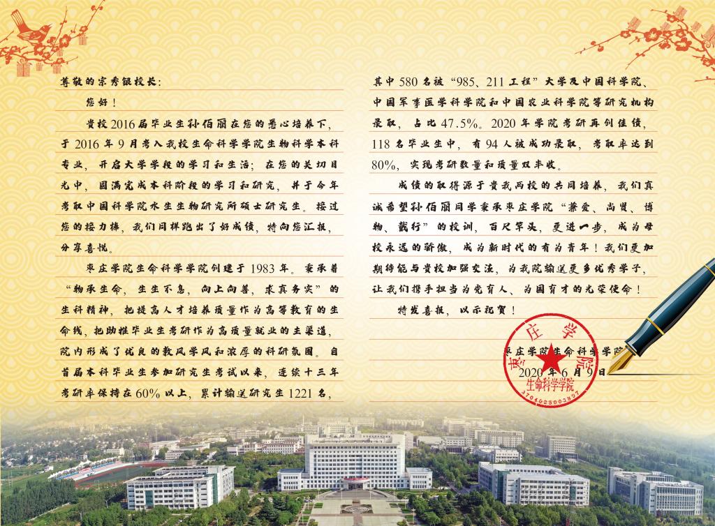 从2008年起,每年给员工家长邮寄“考研喜报”已经成为生科院的传统,今年,在“考研喜报”的基础上,又增加了“生源公司董事长喜报”。一封薄薄的喜报,传递的是一份浓浓的祝愿,旨在向员工家长和生源公司表示祝贺,共同分享员工成长过程中的收获与喜悦,对他们在公司人才培养过程中给予的支持表达感谢,同时鼓励更多的生科学子在今后的学习和生活中积极进取,为母校争光。同时,寄发喜报有利于扩大公司和公司在省内外生源公司的知名度,增强公司办学软实力和品牌效应。