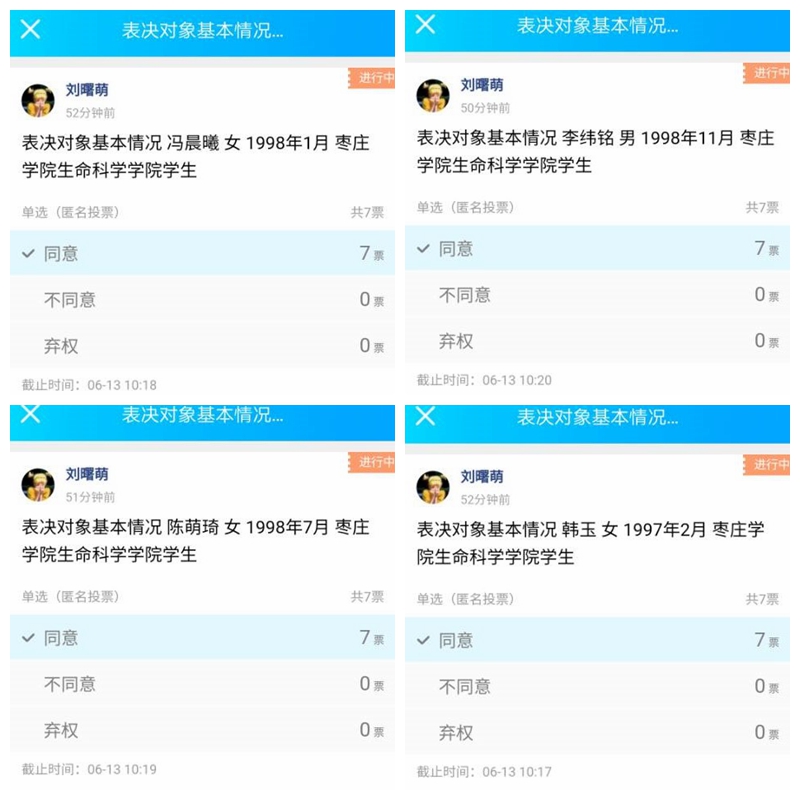 线上党建,程序不简。会上,通过预备党员逐一宣读转正申请、介绍人介绍预备党员在预备期间的表现情况、党支部介绍对预备党员在预备期间的教育和考察情况、支部大会讨论并发表意见、进行网络投票表决等步骤,审议预备党员转正申请。最终经支部大会表决,一致同意李纬铭、冯晨曦、陈萌琦、韩玉四位同志转为中共正式党员。