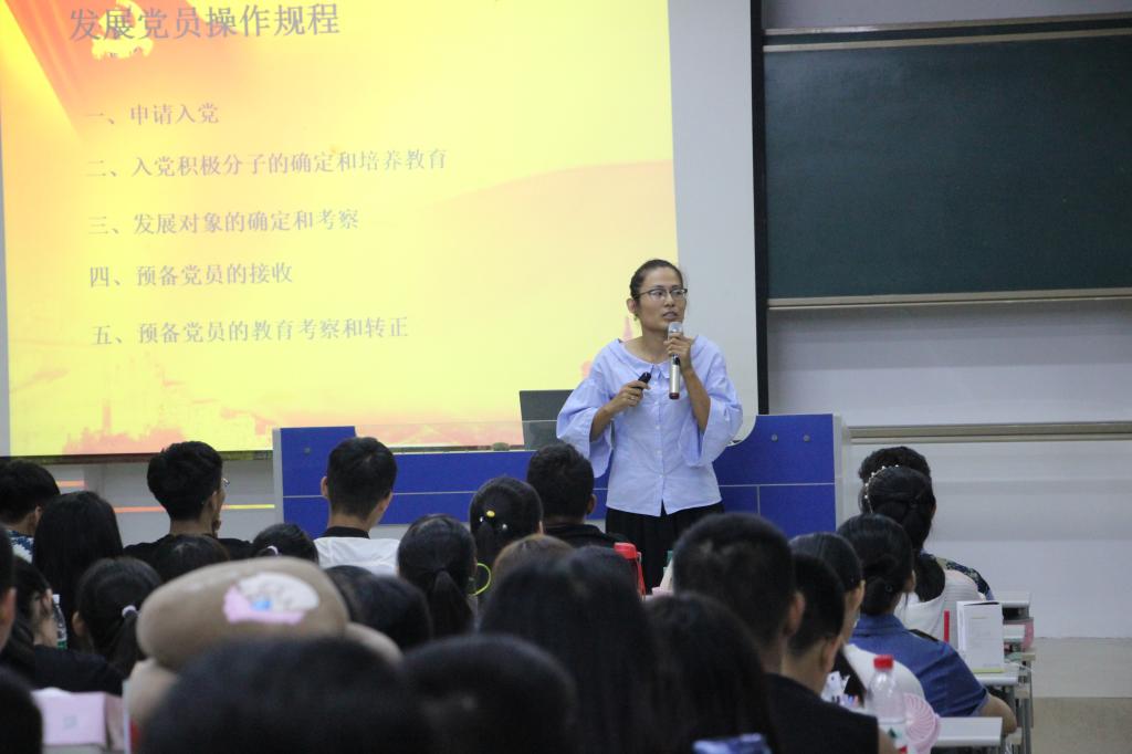 为了加深新生对党的了解,让新生熟悉入党的基本流程,太阳成集团tyc9728于9月16日晚7点30分在理工楼2205召开了新生入学教育之入党启蒙会议,公司党总支组织员曹海青老师负责主讲,2019级全体新生参加了本次会议。