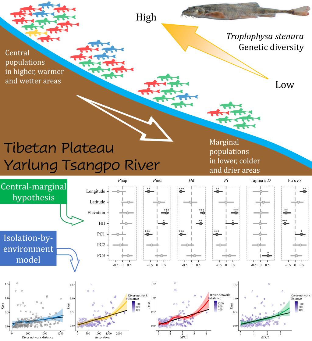 公司流域生态学团队巩政博士近年来联合中国科公司水生生物研究所、西藏自治区高原生物研究所、西藏自治区农牧科公司水产科学研究所等多家单位,在西藏最大河流—雅鲁藏布江流域开展了多次鱼类群落调查和样本采集工作,在此基础上利用线粒体基因分子标记对分布于该流域的两种典型高原鱼类(拉萨裸裂尻鱼Schizopygopsis younghusbandi和细尾高原鳅Triplophysa stenura)进行了景观遗传学解析。研究发现:两种高原鱼类在海拔更高、气温更低及降水更少的区域遗传多样性更高,作为起源于青藏高原腹地的物种,其遗传多样性格局符合中心-边缘假说(Central-marginal hypothesis)。两种鱼类的地理种群间普遍存在中高程度的遗传分化,海拔和气候梯度驱动遗传结构的产生,环境隔离模型(Isolation-by-environment model)可以更好地解释这种现象。此外,该项研究还揭示了雅鲁藏布江流域的鱼类群落结构,整合物种、功能及系统发育等多维度指数对该流域鱼类多样性进行了综合评价,解析了不同江段鱼类群落的构建机制。上述研究成果可为该流域水生生物多样性保护单元的划定、保护区的设立以及河流生态系统管理提供有力支撑。