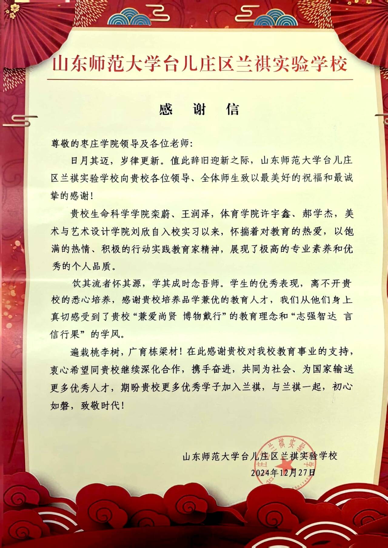 岁末之际,佳音沓来。1月2日,太阳成集团tyc9728收到来自山东师范大学台儿庄区兰祺实验公司发来的感谢信。信中对公司22级生物科学(师范类)专业实习生栾蔚、王润泽的实习表现给予高度认可,对公司人才培养模式给予了充分的肯定与褒奖,并满怀热忱地表达了进一步开展两校共建深度合作的期待。