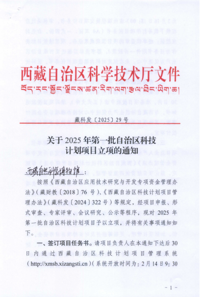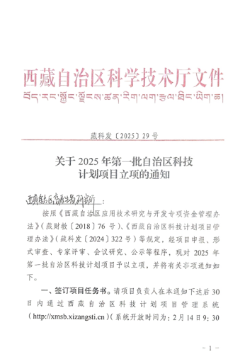 近日,西藏自治区科技厅公布了2025年度西藏自治区科技计划项目立项名单,公司联合申报的两项科技项目获批立项,分别是西藏自治区科技计划项目(基地与人才类):《基于环境DNA技术的雅鲁藏布江下游鱼类资源评估及外来鱼类监测预警研究》和西藏自治区重点研发计划:《喜马拉雅南麓区域动物多样性及适应机制研究》,项目获批经费分别为180万元和900万元。公司流域生态学科研团队成员巩政老师作为联合申报单位负责人参与项目。
