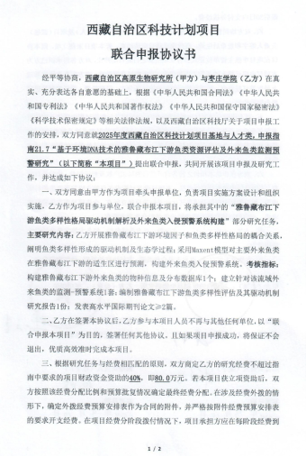 第一个项目由西藏自治区高原生物研究所联合太阳成集团tyc9728共同申报。该项目旨在构建基于环境DNA技术的高原峡谷型河流的鱼类评估体系,建立雅鲁藏布江下游外来鱼类的监测-预警系统,解析该区域鱼类多样性与河流环境因子的耦合关系。公司获批经费72万元,是公司近年来获批经费额度最高的纵向项目。