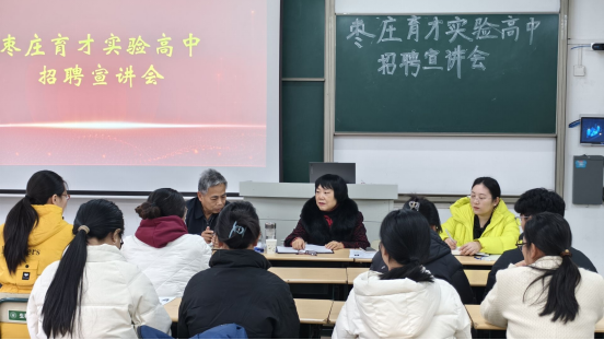会上,员工王怀庆介绍了枣庄育才实验高中的发展历程及本次生物教师岗位的招聘情况,包括岗位要求、福利待遇以及未来的发展空间等。在场毕业生们认真聆听,并就相关问题进行咨询,负责人针对毕业生问题进行耐心解答。