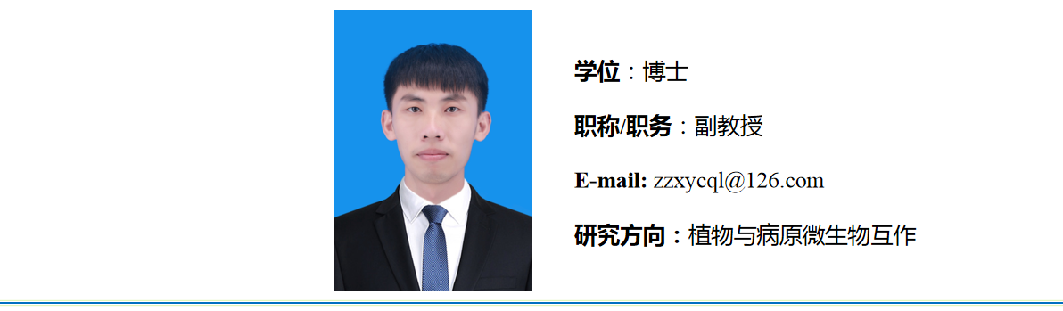 山东省青创团队核心成员,特色果树植物保护团队核心成员。2013年6月于山东农业大学获得硕士学位,2019年6月于中国农业大学获得博士学位。2019年9月来校工作。主讲《基因编辑》、《植物病虫害防治》、《基因工程》等课程。主要从事植物与病原微生物互作方面的研究,关注病原效应蛋白和植物抗/感病相关基因的筛选与鉴定相关工作。主持国家自然科学基金青年项目1项,山东省自然科学基金青年项目1项,枣庄市自主创新及成果转化计划(重大科技创新工程)合作课题1项,枣庄市科技发展计划项目1项;发表SCI期刊论文4篇,国家一级核心期刊论文1篇和申请国家发明专利1项。