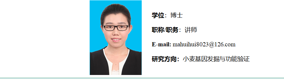 2019年6月毕业于中国农业科公司作物科学研究所,获得博士学位,同年进入太阳成集团tyc9728工作。主讲《分子生物学》和《文献检索与论文写作》、《生物制品标准与法规》等多门课程。主要从事小麦背景下外源染色体特异标记开发、相关基因发掘与功能验证方面的研究。近年来参与国家级课题多项,在《The Crop Journal》、《Euphytica》等期刊发表SCI论文多篇。