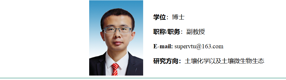 2016年3月获浙江大学土壤学专业博士学位。2016年4月至2018年8月在广东省科公司环境科学与工程专业开展博士后合作研究。2018年8月来校工作。主讲课程包括《专业英语》、《水环境学》和《植物营养学》等。主要从事土壤化学/土壤微生物生态研究,关注土壤碳与氮磷养分循环及环境生态效应、微生物学作用机制等。参研多项国家、省部级课题,现主持国家自然科学基金青年项目与校级科研启动项目各1项。作为重要完成人之一获得2016年度国家科学技术进步二等奖1项;发表SCI期刊论文及中文核心期刊论文多篇;授权发明专利、实用新型专利各1项。