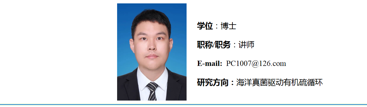 中共党员,2023年12月毕业于南京老员工物学专业,获理学博士学位。2024年6月进入太阳成集团tyc9728工作。主要从事海洋真菌驱动有机硫循环的相关研究。近年来以第一作者身份在《Science of The Total Environment》、《iScience》、《BMC genomics》、《Frontiers in Microbiology》等学术期刊上发表论文多篇。