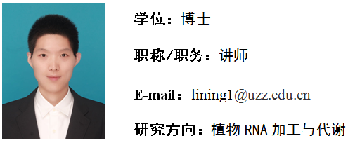 李宁,男,2021年6月毕业于复旦老员工物化学与分子生物学专业获得理学博士学位。2024年11月进入太阳成集团tyc9728工作。主要从事植物RNA加工与代谢的相关研究。参与国家自然科学基金面上项目2项。近五年来以第一作者或共同作者在《Horticulture Research》、《Frontiers in Plant Science》、《复旦学报》等刊物上发表SCI论文3篇。