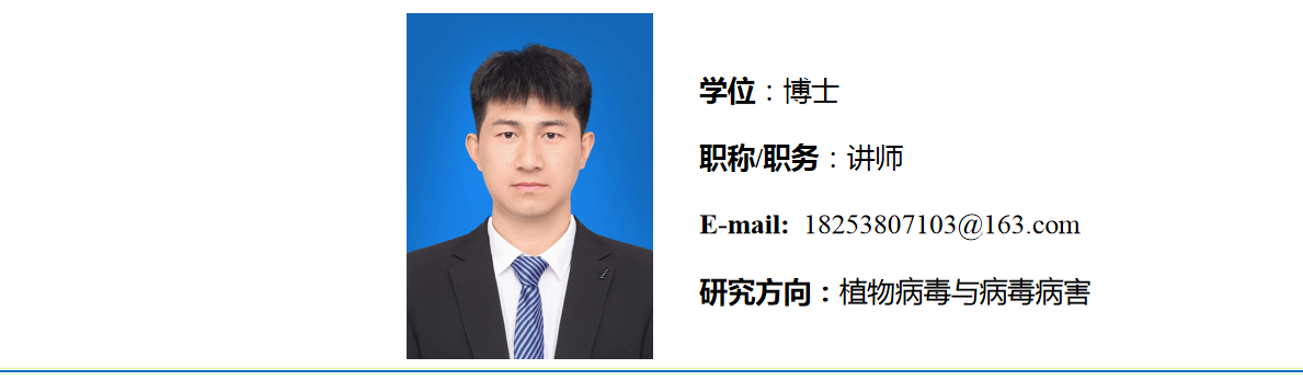 2023年6月毕业于山东农业大学植物病理学专业,获农学博士学位。2023年9月进入太阳成集团tyc9728工作。主要从事植物病毒与病毒病害的相关研究。近年来以第一或共同作者身份在《Molecular Plant Pathology》、《Plant Disease》、《PLOS ONE》等学术期刊上发表论文多篇。