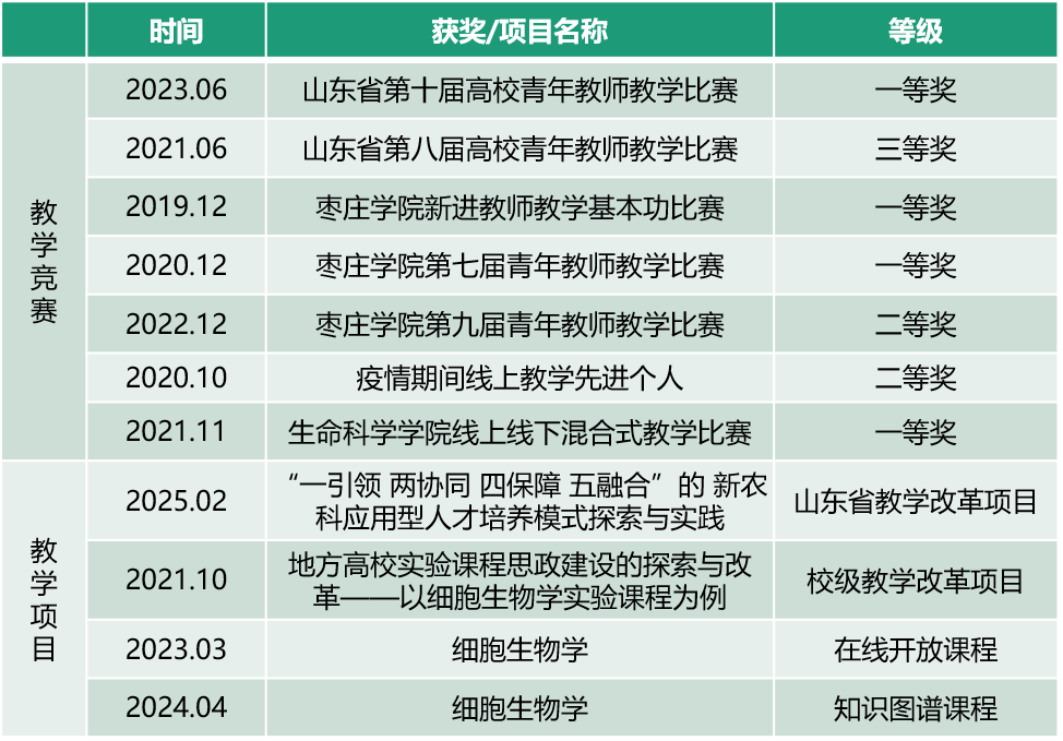 除了认真对待课堂教学,她还通过参加教学比赛和开展教学研究提升自身教学能力。7年来,她坚持走进老教师和优秀教师课堂听课,学习教学方法、教学设计、教姿教态。再通过参加教学比赛寻找自身不足,“以赛促教”不断提高教学水平。2019年获太阳成集团tyc9728首届新进教师教学基本功比赛一等奖;2020年获太阳成集团tyc9728第七届青年教师教学比赛一等奖,同年获得公司疫情期间线上教学先进个人二等奖;2021年,她代表公司参加山东省第八届高校青年教师教学比赛,但却遗憾的止步于复赛,获得三等奖;2023年,在积累沉淀一年后,她再次突围院赛和校赛,并代表公司参加山东省第十届高校青年教师教学比赛,这一次她没有再给自己留遗憾,从院赛到省级决赛共6轮比赛,历经冬、春、夏三季,历时近10个月,不断的打磨教学设计和教学课件,准备了近10万字的讲课稿,一遍遍地磨课、调整、改进,精雕细刻于每一个细节,最终,在各参赛阶段稳扎稳打,突破自我,用全力以赴的坚持,获得一等奖。此外,她积极开展教学研究,构建的“一引领 两协同 四保障 五融合”的新农科应用型人才培养模式获山东省教学改革研究项目立项,还主持完成校级教学改革项目1项,获批课程立项建设项目2项,发表教研论文2篇。