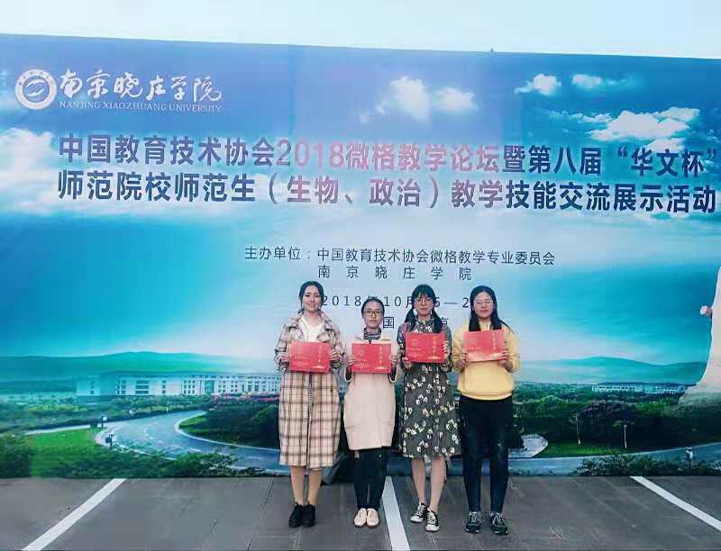 由中国教育技术协会微格教学专业委员会主办的第八届“华文杯”全国师范院校师范生教学技能大赛决赛,于2018年10月26—28日在南京晓庄公司举行。决赛由教学设计、说课、模拟授课和现场答辩4个环节组成,来自北京师范大学等106所全国师范院校的近700名选手参加了此次大赛。经过激烈比拼,公司员工表现良好,取得了优异成绩,2016级生物科学专业的于湘钒、刘艳丽、梁延群、盛文静同学在教学技能比赛中获得一等奖1项、二等奖2项、三等奖1项,同时获得4项教学设计奖。