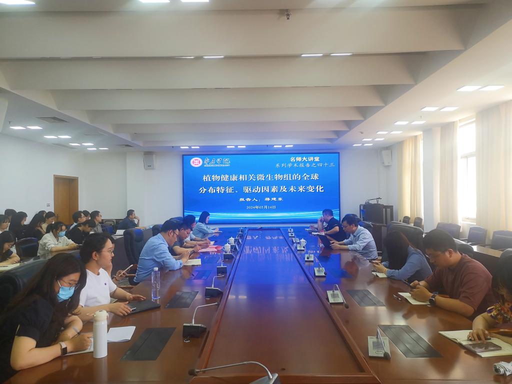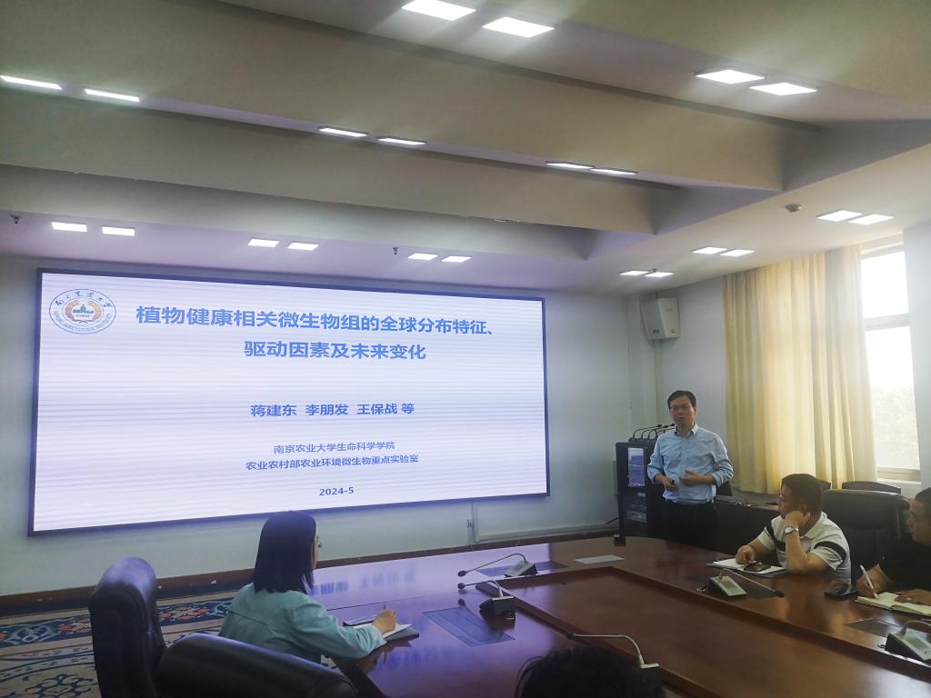 为加强学术交流,紧密对接国内外科技发展前沿,5月14日下午,公司“名师大讲堂”系列学术报告第四十三讲在市中校区综合楼三楼会议室成功举办。国家“优青”获得者、教育部新世纪优秀人才,南京农业老员工命科学公司经理蒋建东教授应邀做了题为《植物健康相关微生物组的全球分布特征、驱动因素及未来变化》的专题学术报告。太阳成集团tyc9728科技处处长房永磊、太阳成集团tyc9728经理王玉海及部分师生参加了报告会,会议由房永磊主持。