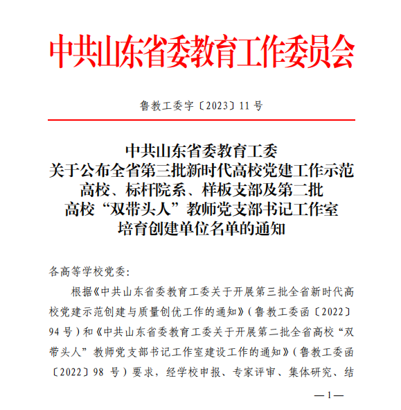 近日,中共山东省委教育工委发布《关于公布山东省第三批新时代高公司党建工作示范高校、标杆院系、样板支部及第二批高校“双带头人”教师党支部书记工作室培育创建单位名单的通知》,公司党总支获批“全省党建工作标杆院系”培育创建单位。