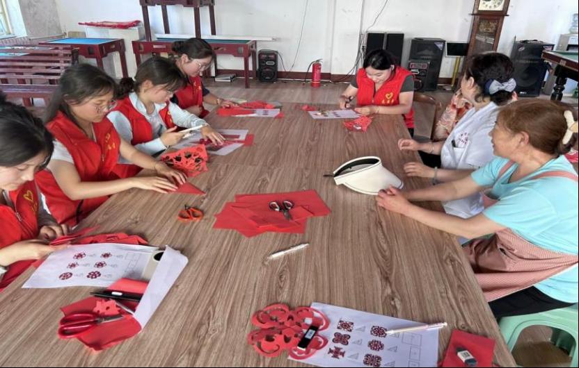 活动伊始,志愿者向老人讲解剪纸艺术的历史渊源与文化内涵,并将复杂的剪纸步骤拆解为折纸、描线、剪裁等简单易懂的环节。在志愿者的耐心指导下,老人们专注创作,红纸在剪刀起落间化作花鸟等精美图案。