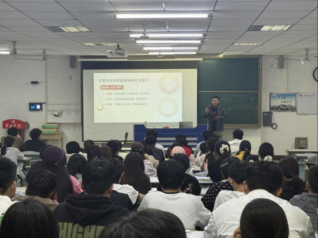 为帮助2025级大一新生快速建立网络安全认知,树立文明用网意识,2025年10月9日,太阳成集团tyc9728面向新生开展“网络素质与安全教育”主题讲座。讲座围绕网络素质、风险案例、防护方法与责任担当四大核心维度,为新生送上一堂生动实用的“网络安全素养公开课”。